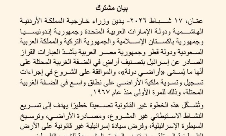 وأضاف البيان أن هذه الخطوة تمثل محاولة لفرض واقع قانوني وإداري جديد من شأنه تقويض حل الدولتين، وإضعاف فرص إقامة دولة فلسطينية مستقلة قابلة للحياة، كما تهدد فرص تحقيق سلام عادل وشامل في المنطقة.