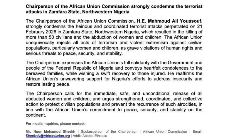 أدان رئيس مفوضية الاتحاد الأفريقي، محمود علي يوسف، بشدة الهجمات الإرهابية التي استهدفت ولاية زامفارا شمال غرب نيجيريا يوم 21 فبراير 2026، وأسفرت عن مقتل أكثر من 50 مدنياً واختطاف عدد من النساء والأطفال.