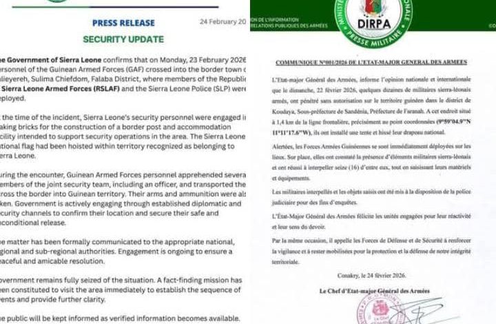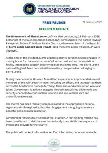 أعلنت حكومة سيراليون أن عناصر من القوات المسلحة الغينية عبروا، يوم الاثنين 23 فبراير 2026، إلى بلدة يينغِرِه في مشيخة سُليما بمقاطعة فالابا، حيث كانت وحدات من القوات المسلحة السيراليونية والشرطة منتشرة في المنطقة.