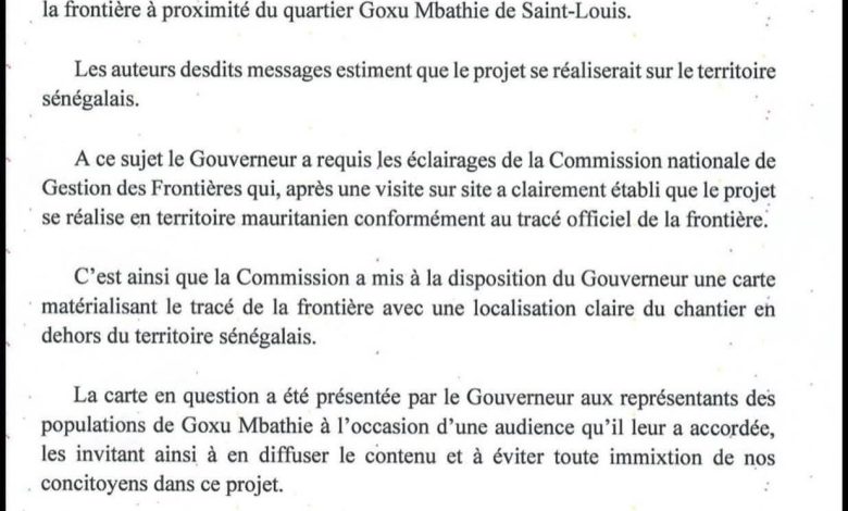 وأوضح حاكم جهة سان لويس، في بيان صادر بتاريخ 27 فبراير 2026، أنه لوحظ خلال الأيام الماضية تداول مقاطع فيديو ورسائل صوتية على شبكات التواصل الاجتماعي، لأشخاص يعترضون على مشروع إنشاء مركز مراقبة من طرف الجمهورية الإسلامية الموريتانية قرب حي “غوكسو مباتيه” بمدينة سان لويس، بدعوى أنه يُقام داخل الأراضي السنغالية.