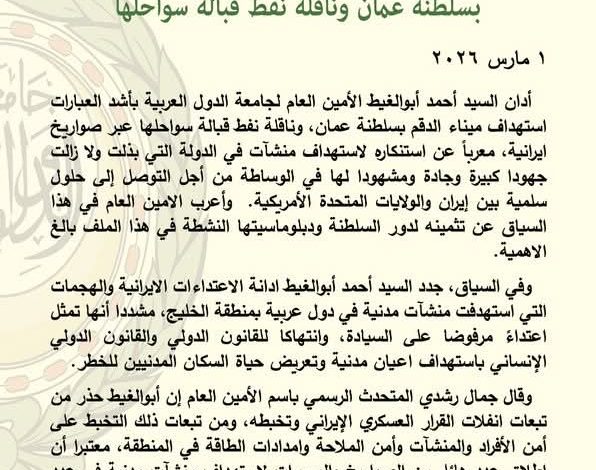 وأوضح بيان صادر عن المكتب الصحفي للجامعة أن أبو الغيط اعتبر استهداف منشآت في دولة تبذل جهودًا دبلوماسية حثيثة في الوساطة لتخفيف التوترات الإقليمية أمرًا مرفوضًا، مشيدًا بالدور الذي تضطلع به السلطنة في دعم مساعي الحلول السلمية.