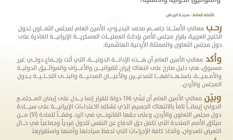 وأشار البديوي إلى أن القرار يعزز دعم المجتمع الدولي لأمن واستقرار دول مجلس التعاون والأردن، ويؤكد أهمية منطقة الخليج في حفظ السلم والأمن الدوليين، نظراً لدورها الحيوي في استقرار الاقتصاد العالمي وأمن الملاحة البحرية.