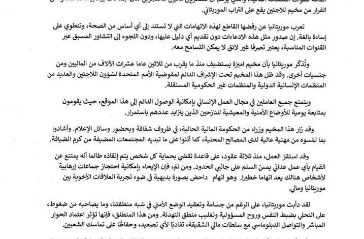 وأوضح البيان أن مخيم “امبره” للاجئين تستضيفه موريتانيا منذ نحو ثلاثين عاماً، ويضم عشرات الآلاف من اللاجئين من مالي ومن جنسيات أخرى، مشيراً إلى أن المخيم يخضع لإشراف دائم من مفوضية الأمم المتحدة لشؤون اللاجئين وعدد من المنظمات الإنسانية الدولية وغير الحكومية.