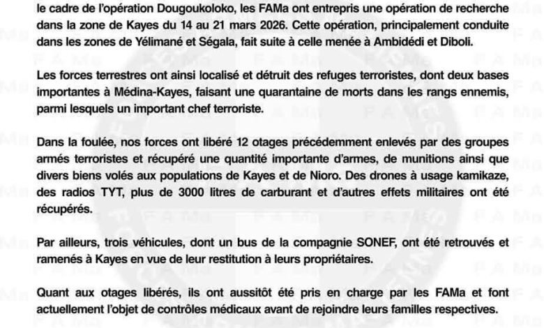 أعلنت هيئة الأركان العامة للقوات المسلحة في مالي مقتل نحو 40 مسلحًا، من بينهم قيادي بارز، وذلك خلال عملية عسكرية استهدفت مخابئ وصفت بـ”الإرهابية” في مدينة خاي غربي البلاد، قرب الحدود مع موريتانيا.
