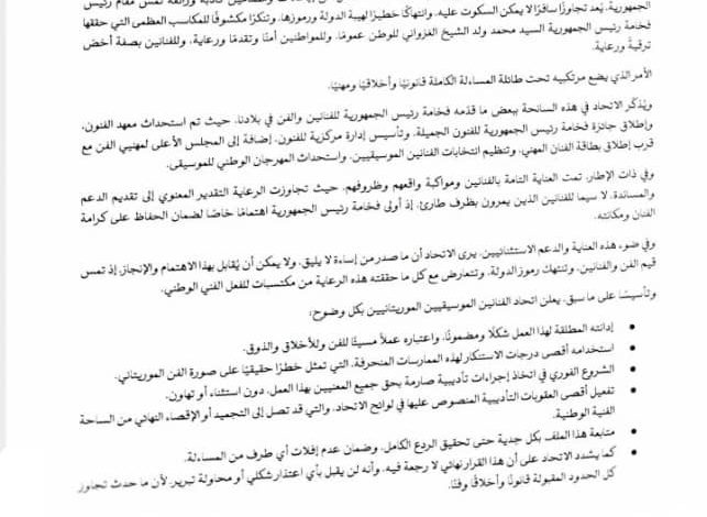 وختم الاتحاد بيانه بالتأكيد على عزمه مواصلة حماية الفن الموريتاني من كل أشكال الإساءة، والعمل على ترسيخ دوره كحامل للقيم الجمالية والثقافية.