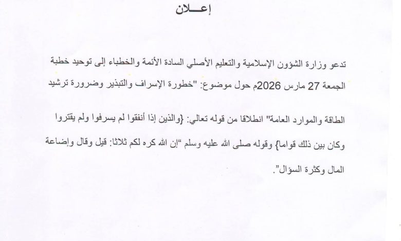 وزارة الشؤون الإسلامية تدعو لتوحيد خطبة الجمعة حول ترشيد الإنفاق ومحاربة الإسراف