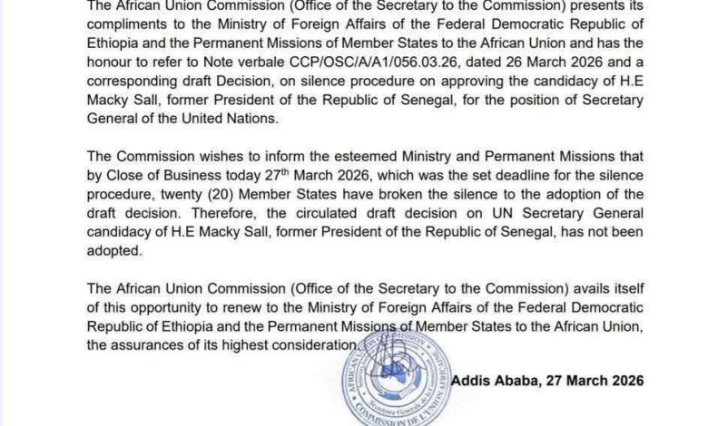 وأشار الاتحاد الإفريقي إلى أن مشروع القرار كان يهدف إلى توحيد موقف الدول الإفريقية خلف ترشيح الرئيس السنغالي السابق، غير أن الاعتراضات حالت دون تحقيق هذا التوافق.