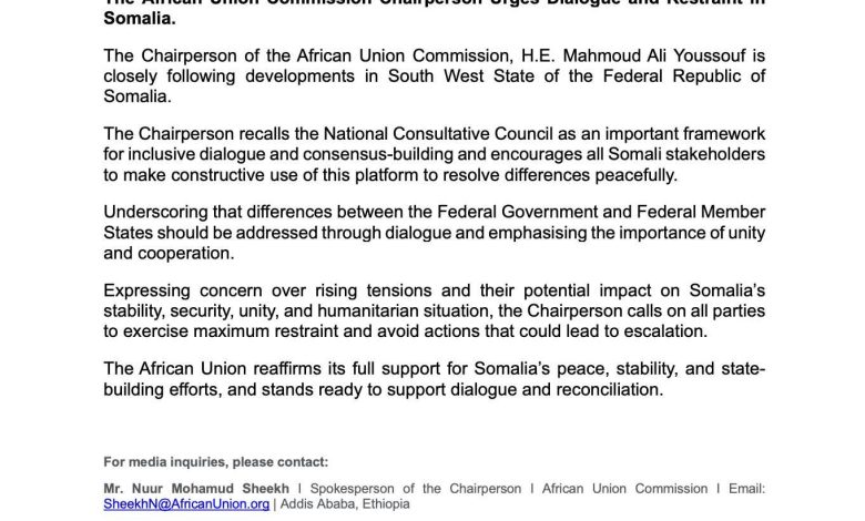وأعرب الاتحاد الإفريقي عن قلقه إزاء تصاعد التوترات وانعكاساتها المحتملة على الأمن والاستقرار والوضع الإنساني في الصومال، داعياً جميع الأطراف إلى التحلي بأقصى درجات ضبط النفس وتجنب أي خطوات قد تؤدي إلى مزيد من التصعيد.