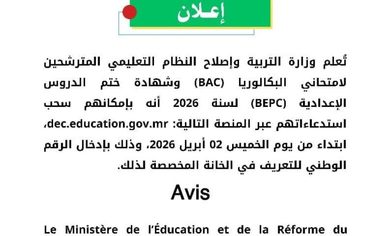 أعلنت وزارة التربية وإصلاح النظام التعليمي في موريتانيا أن بإمكان المترشحين لامتحاني البكالوريا وشهادة ختم الدروس الإعدادية (BEPC) لسنة 2026 سحب استدعاءاتهم ابتداءً من يوم الخميس 2 أبريل 2026.