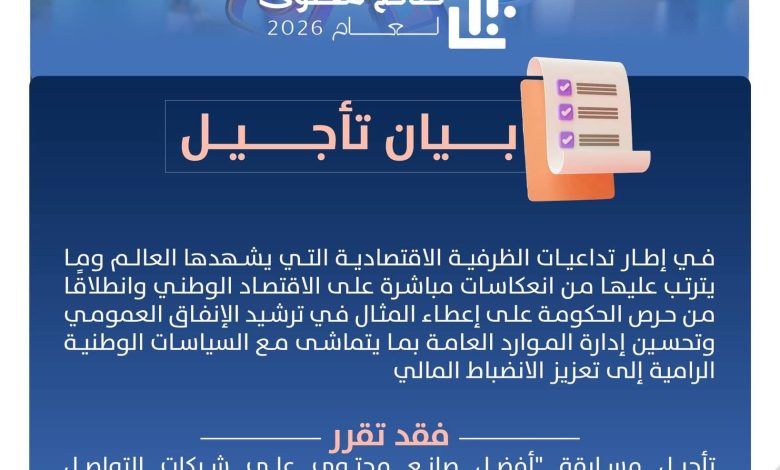 وأوضحت الوزارة أن قرار التأجيل يأتي في ظل تداعيات الظرفية الاقتصادية العالمية، وما تفرضه من انعكاسات مباشرة على الاقتصاد الوطني، مؤكدة أن الخطوة تندرج ضمن توجه الحكومة الرامي إلى ترشيد الإنفاق العمومي وتحسين إدارة الموارد، بما يعزز الانضباط المالي.
