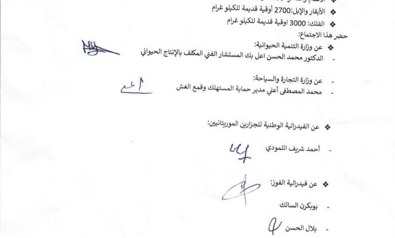 أعلن زوال اليوم السبت، في مباني وزارة التنمية الحيوانية بالعاصمة نواكشوط، عن اعتماد تسقيف لأسعار اللحوم الحمراء، سيبدأ العمل به الإثنين 6 إبريل الجاري، ويعتمد مبلغ 3500 أوقية قديمة كسعر ثابت لكيلوغرام لحم الضأن وللماعز ، و 2700 أوقية قديمة لكيلوغرام لحم الإبل والبقر، في حين يحدد 3000 أوقية قديمة كسعر لكلوغرام الفلكه.