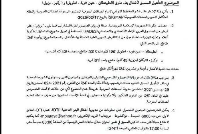 أعلنت وزارة التجهيز والنقل، عبر مديرية أشغال البنى التحتية، عن إطلاق إعلان للتأهيل المسبق (APQ) رقم 01/T/MET/CPMP/2026، يهدف إلى اختيار شركات مؤهلة لتنفيذ مشروع بناء عدد من الطرق في موريتانيا.
