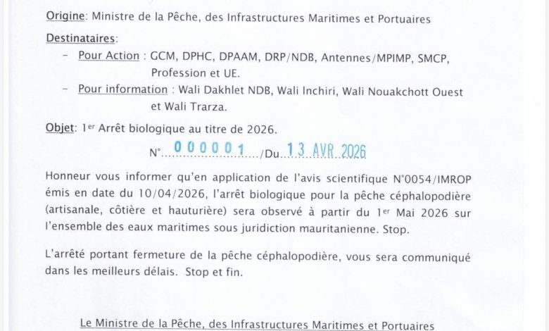 وجاء في مذكرة صادرة عن الوزارة، بتاريخ 13 أبريل 2026، أن هذا القرار يستند إلى رأي علمي صادر عن المعهد الموريتاني لبحوث المحيطات والصيد (IMROP)، أوصى بضرورة اعتماد فترة راحة بيولوجية لضمان استدامة الثروة السمكية.
