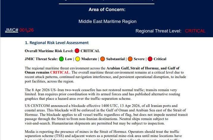 البيئة الأمنية البحرية في الخليج العربي ومضيق هرمز وخليج عمان عند مستوى تهديد حرج (الأعلى تصنيفاً)