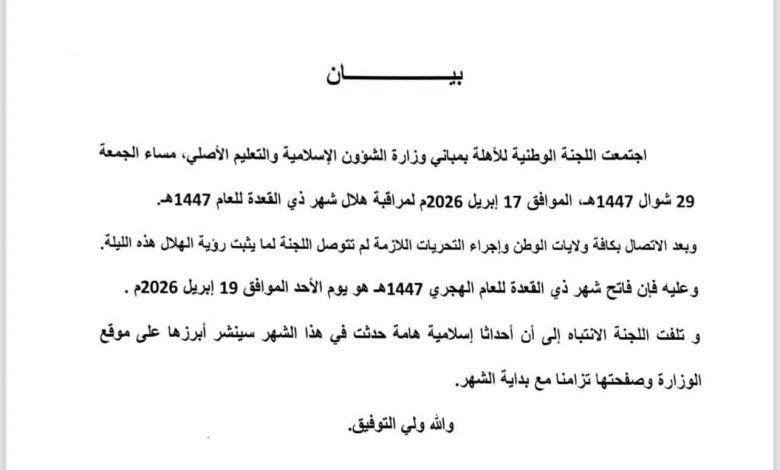 أعلنت اللجنة الوطنية للأهلة، التابعة لوزارة الشؤون الإسلامية والتعليم الأصلي، أن يوم الأحد الموافق 19 أبريل 2026 سيكون فاتح شهر ذي القعدة لعام 1447هـ، وذلك بعد تعذر رؤية الهلال مساء الجمعة.