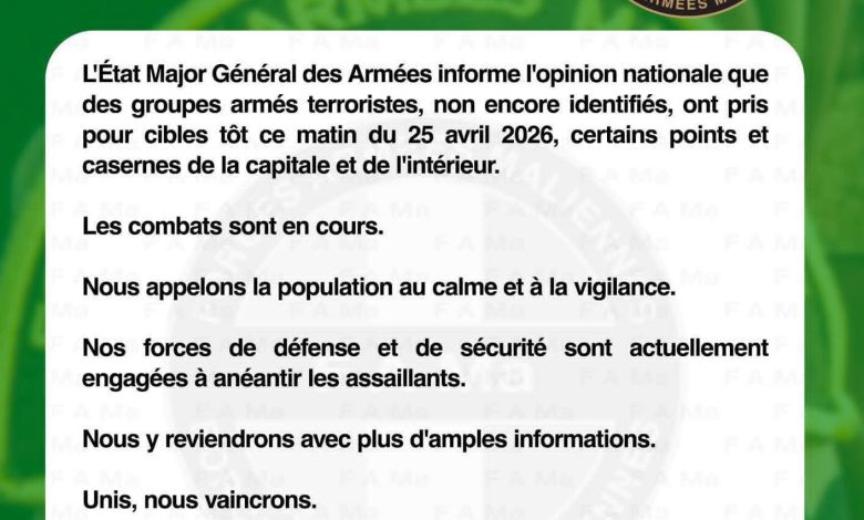 ودعا الجيش السكان إلى التحلي بالهدوء واليقظة، مشيراً إلى أن القوات المسلحة منخرطة في عمليات ميدانية لـ”تحييد المهاجمين”، مع التعهد بتقديم معلومات إضافية حول تطورات الوضع في وقت لاحق.