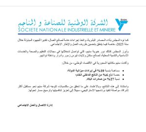 أقرّ مجلس إدارة الشركة الوطنية للصناعة والمناجم (اسنيم)، خلال اجتماعه الأخير، حزمة قرارات ذات طابع اجتماعي لصالح العمال والموظفين، شملت زيادات في الرواتب ومنحًا استثنائية، إلى جانب إطلاق مشاريع سكنية اجتماعية.