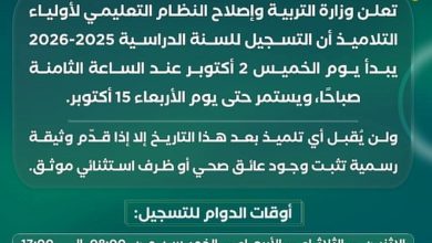 أعلنت وزارة التربية وإصلاح النظام التعليمي أن عملية تسجيل التلاميذ للعام الدراسي 2025-2026 ستبدأ رسميًا يوم الخميس 2 أكتوبر 2025…