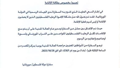 أعلنت سفارة دولة فلسطين في موريتانيا، اليوم الإثنين (27 أكتوبر 2025)، عن التوصل إلى حل لمشكلة الإقامة التي واجهت عدداً…