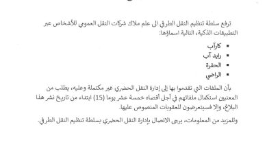سلطة تنظيم النقل تلزم شركات النقل عبر التطبيقات باستكمال ملفاتها خلال 15 يوماً