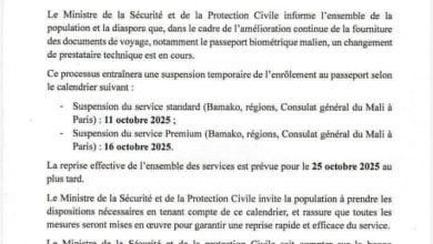 أعلنت وزارة الأمن والحماية المدنية في مالي عن تعليق مؤقت لخدمات التسجيل للحصول على جواز السفر البايومتري، وذلك في إطار…