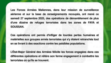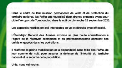 أعلنت القوات المسلحة المالية (فاما) أنها تمكنت، ليلة الأحد 28 سبتمبر 2025، من اعتراض وتدمير طائرتين مسيّرتين معاديتين كانتا تستهدفان…