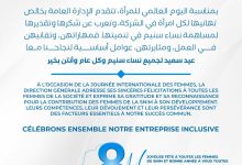 هنأت الشركة الوطنية للصناعة والمناجم جميع النساء العاملات فيها، وذلك بمناسبة اليوم العالمي للمرأة الموافق لـ8 مارس، معبرةً عن…